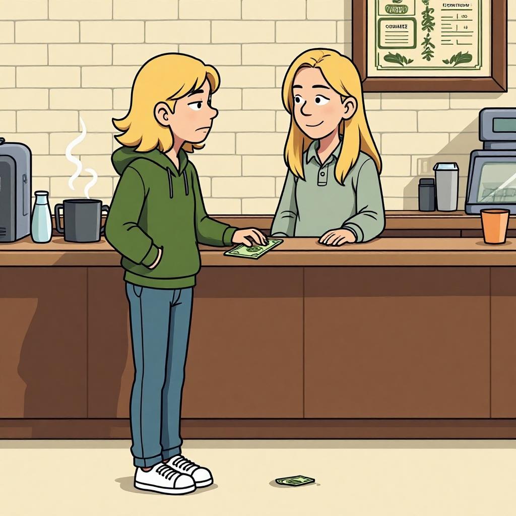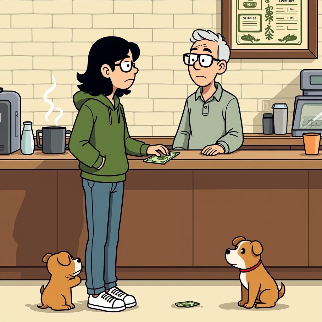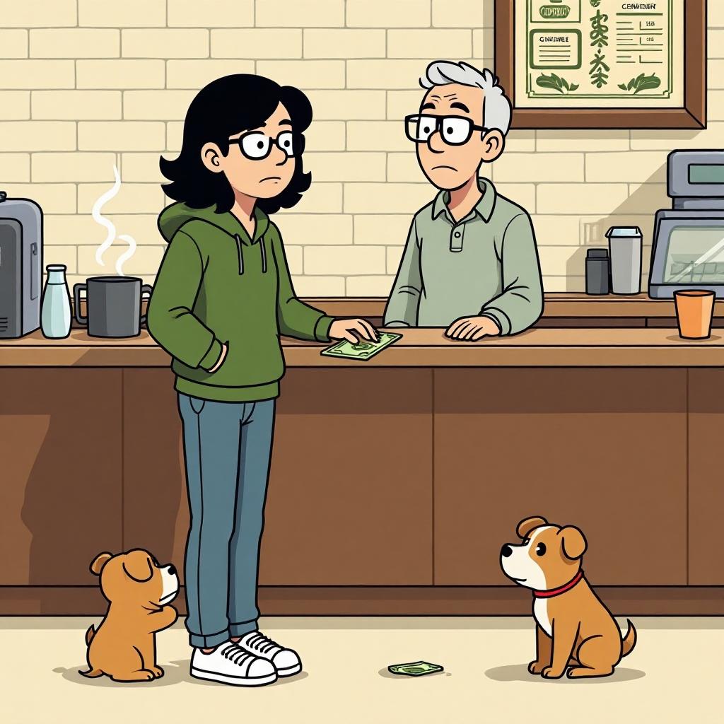 A young woman with a green sweatshirt, halflong black hair, white sneakers, jeans and glasses is standing in a coffee shop first in line. An old man with short hair in shorts behind the counter is looking disappointed. There is a menu map behind him on the wall. He is handing over a dollar bill. The woman is scratching her head in confusion. There is a cute little dog at her feet.